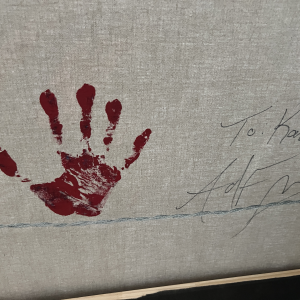 The artist has placed her hand print and dedicated to the buyer on the verso.