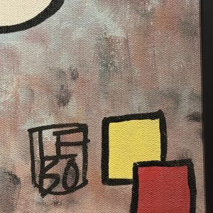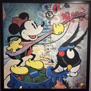 Lebo refers to his artistic style as “Postmodern Cartoon Expressionism,” combining abstract imagery, cartoon drawing, bold hues, and calligraphy together in a narrative style to convey emotion and story.