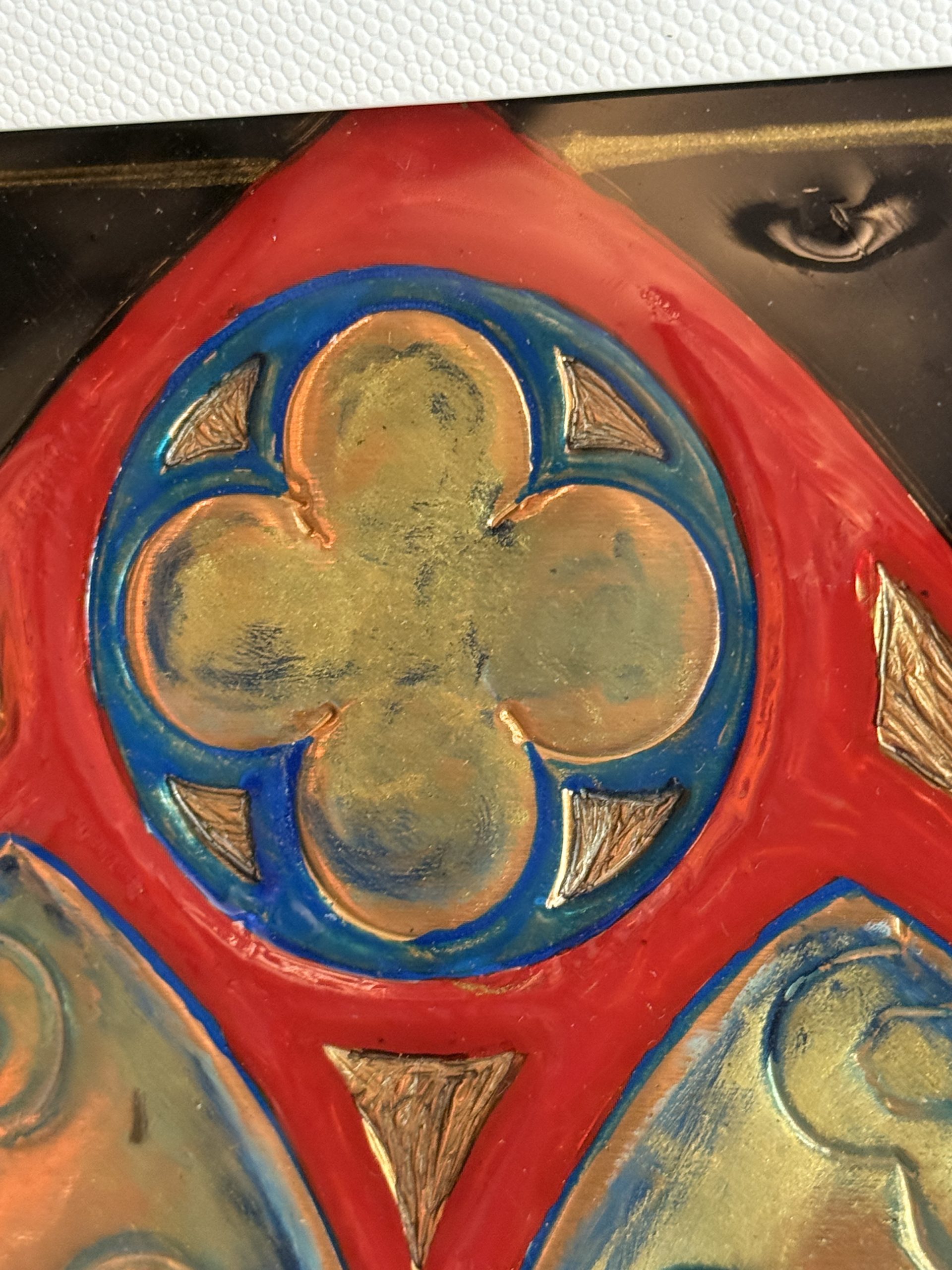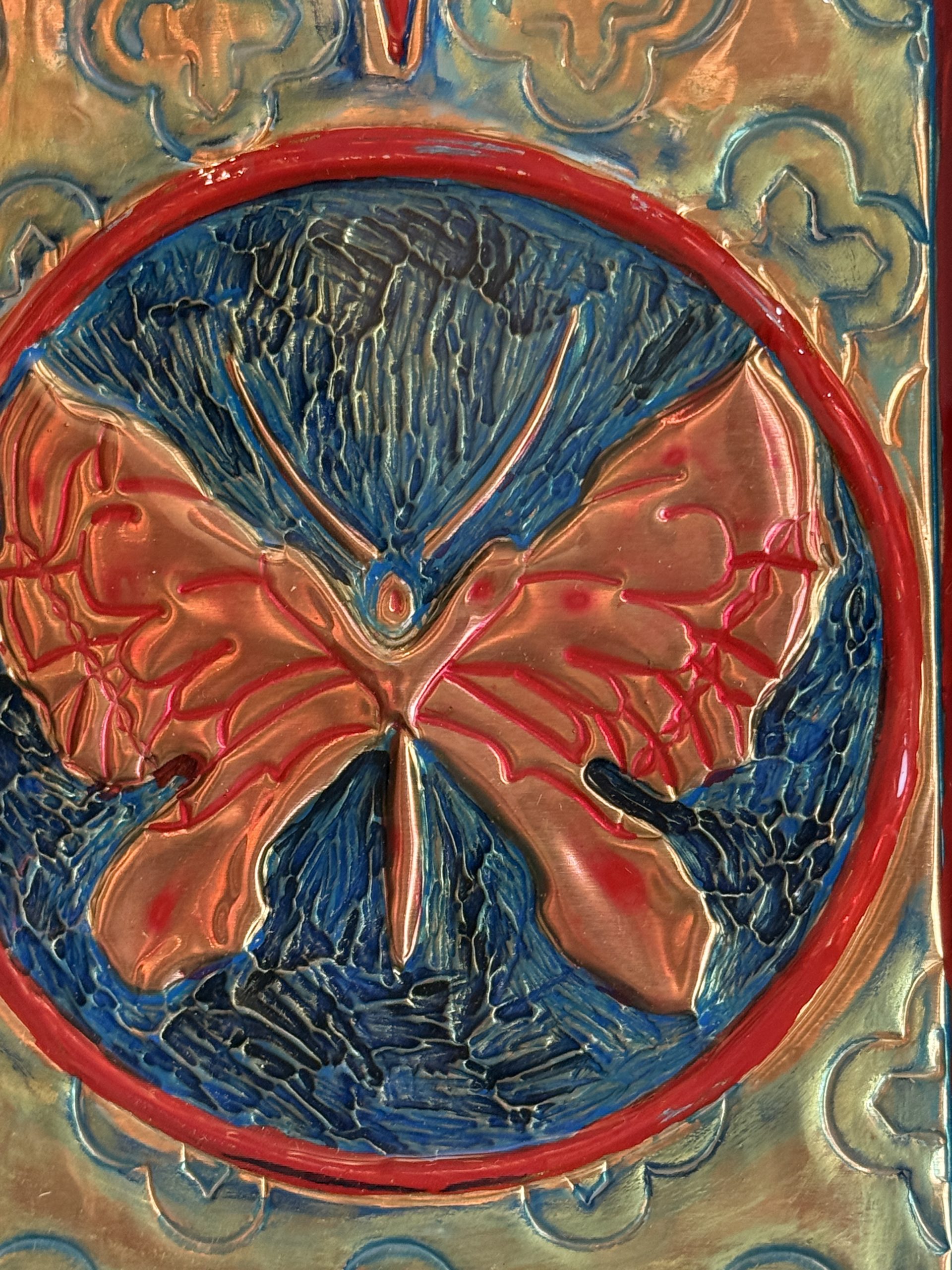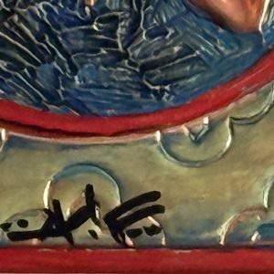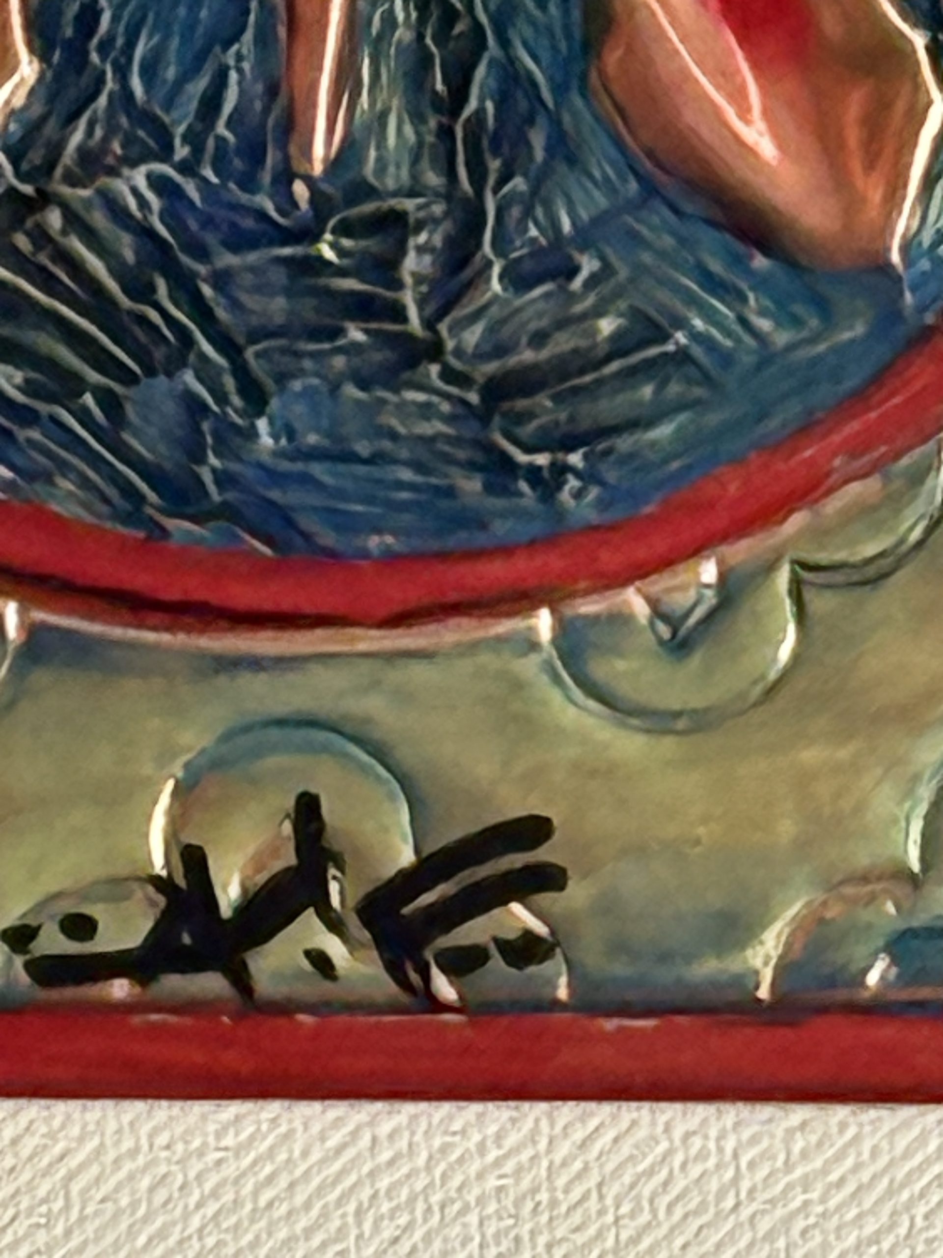 Hand painted metal relief with engraving. Hand signed in pigment lower center by the artist. The artist has placed her hand print in pigment on the verso. Dated on the verso, A unique work.