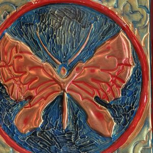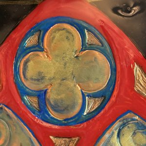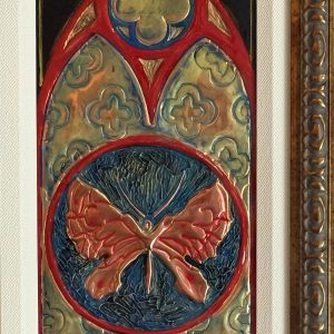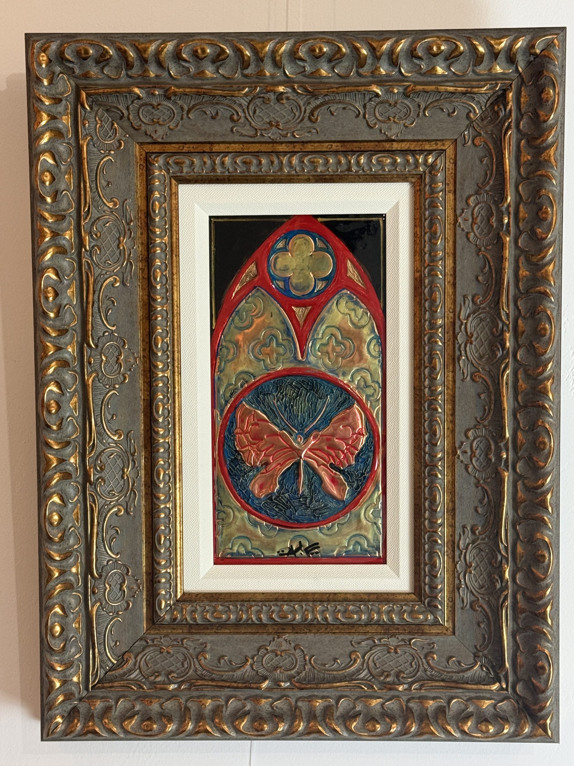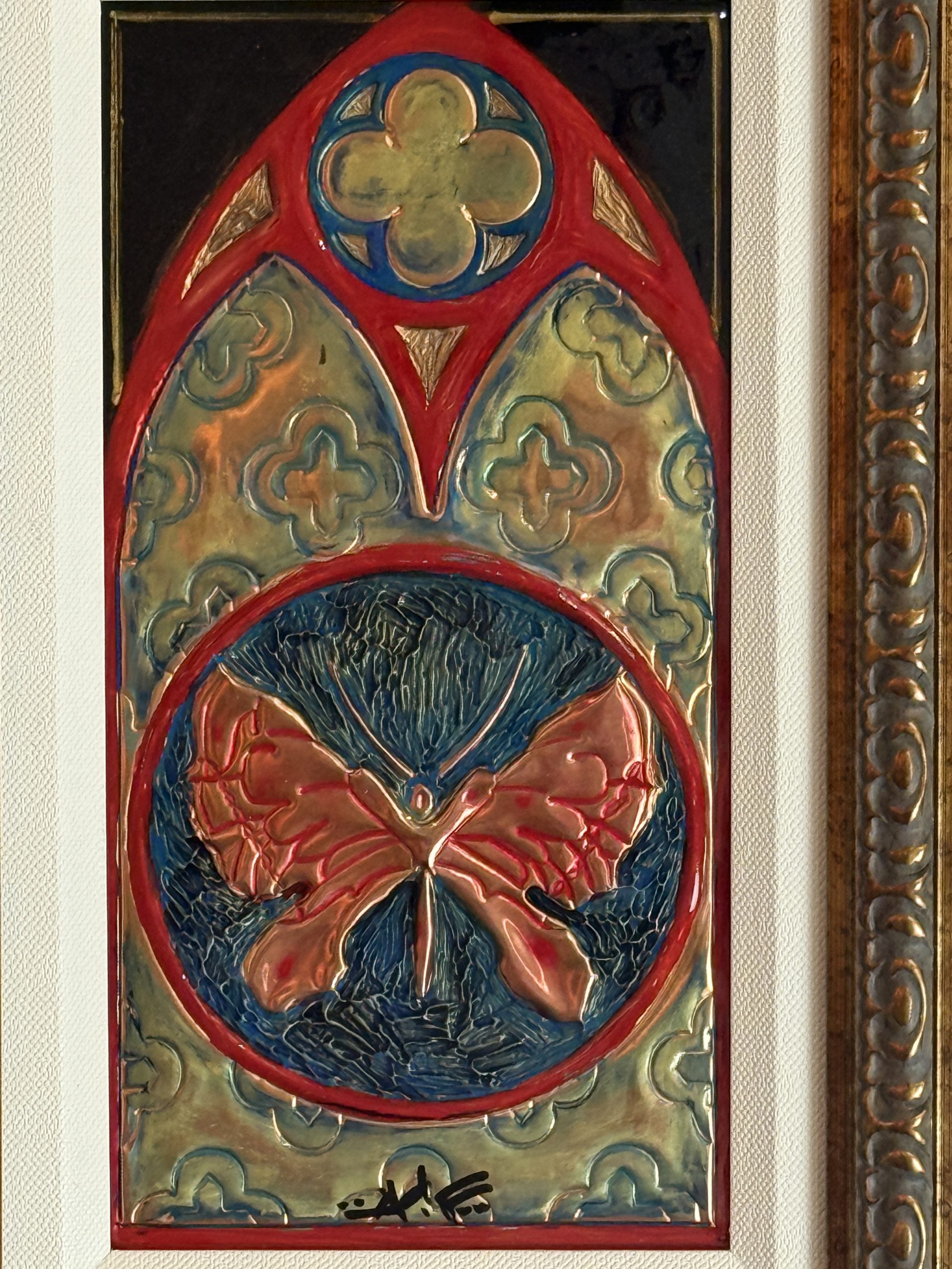 Hand painted metal relief with engraving. Hand signed in pigment lower center by the artist. The artist has placed her hand print in pigment on the verso. Dated on the verso, A unique work.