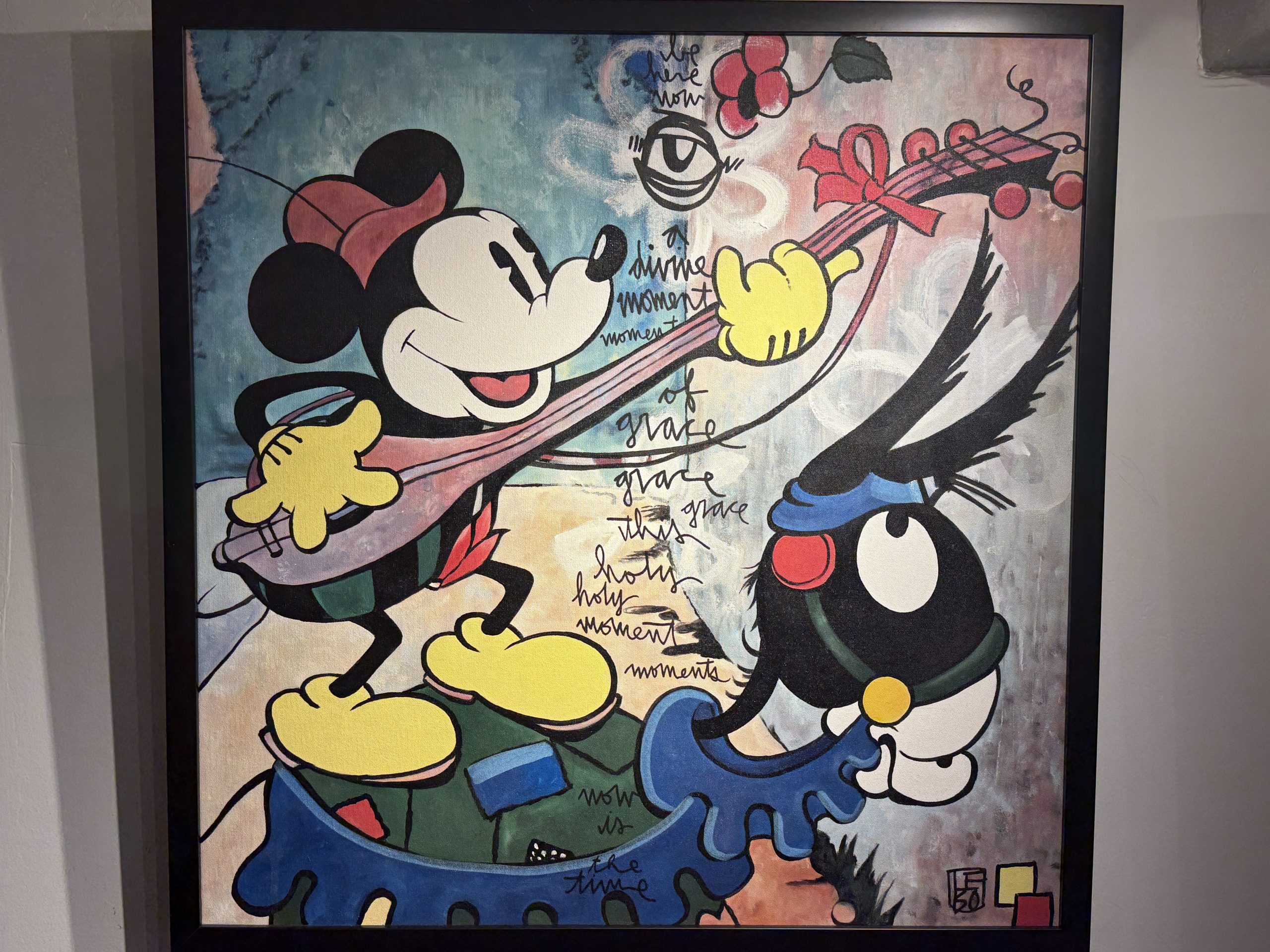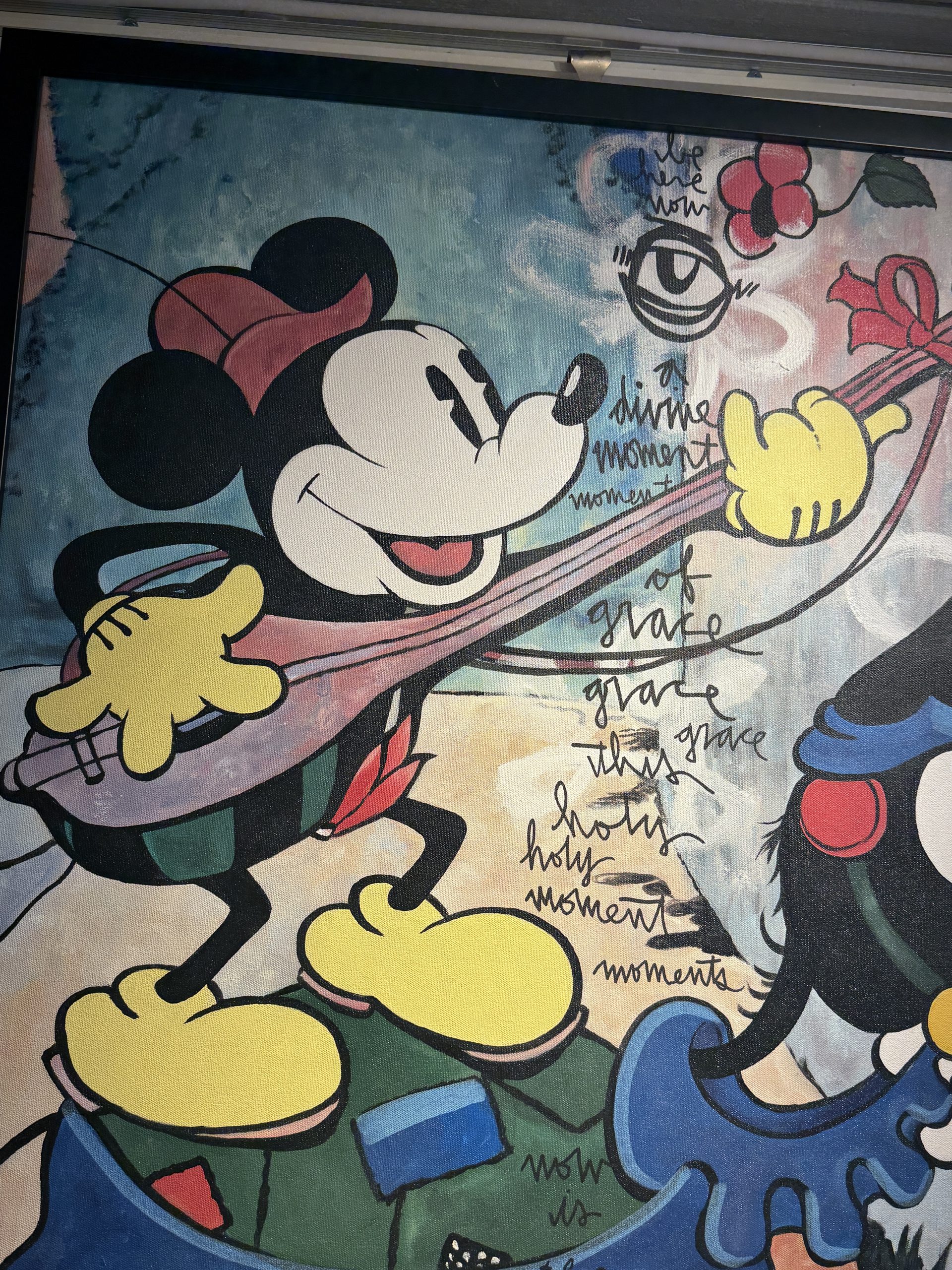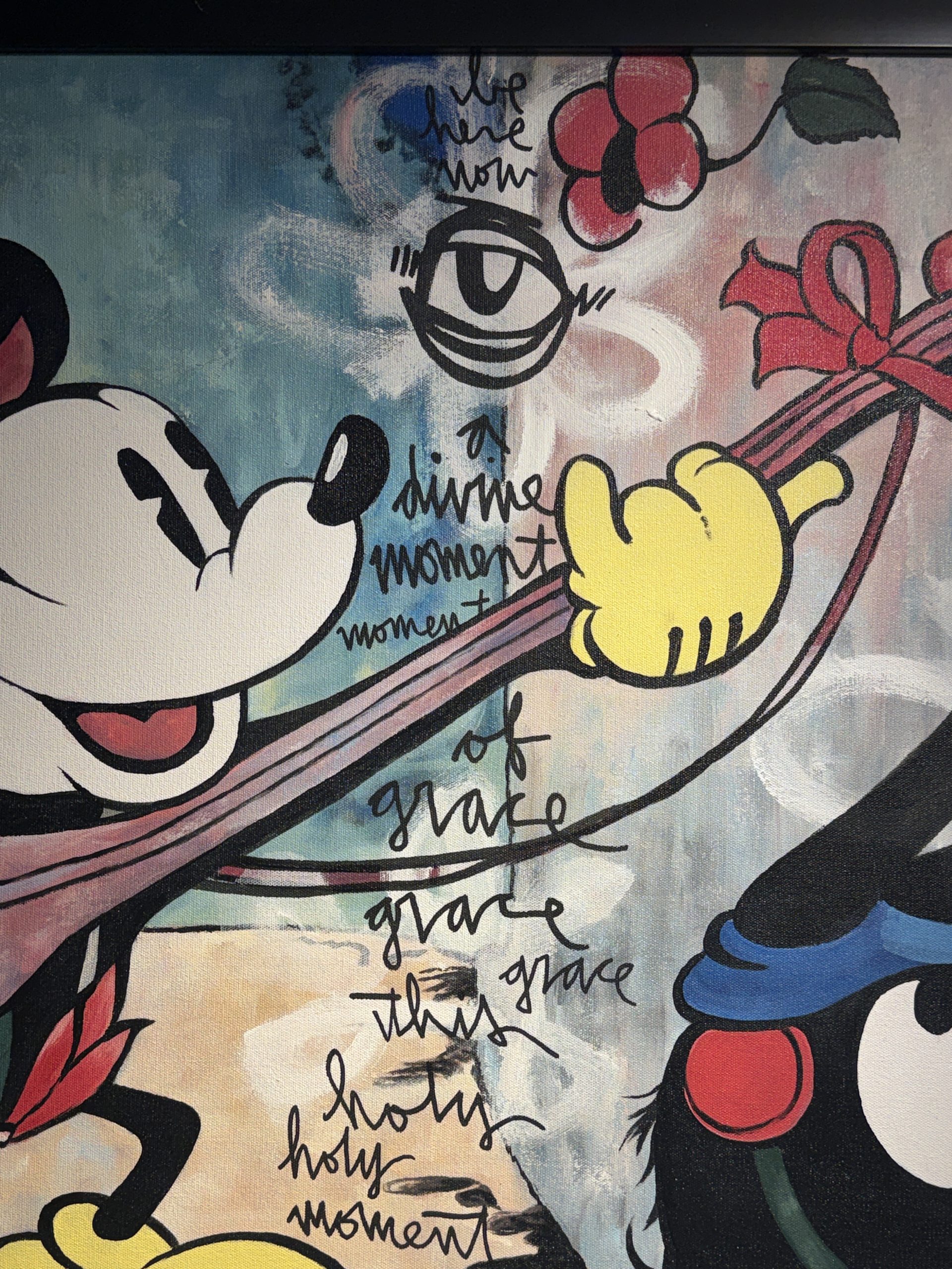 Lebo refers to his artistic style as “Postmodern Cartoon Expressionism,” combining abstract imagery, cartoon drawing, bold hues, and calligraphy together in a narrative style to convey emotion and story.