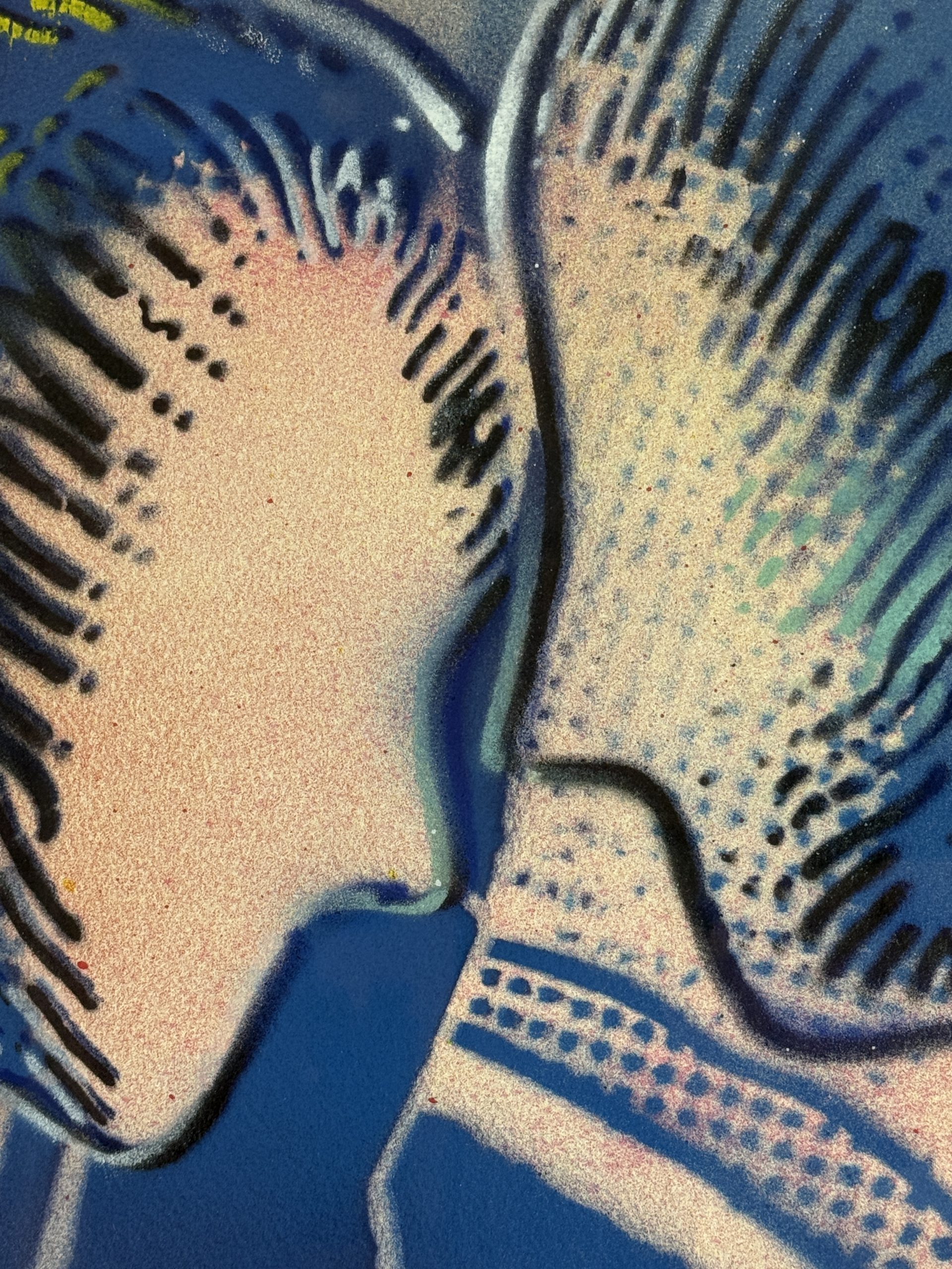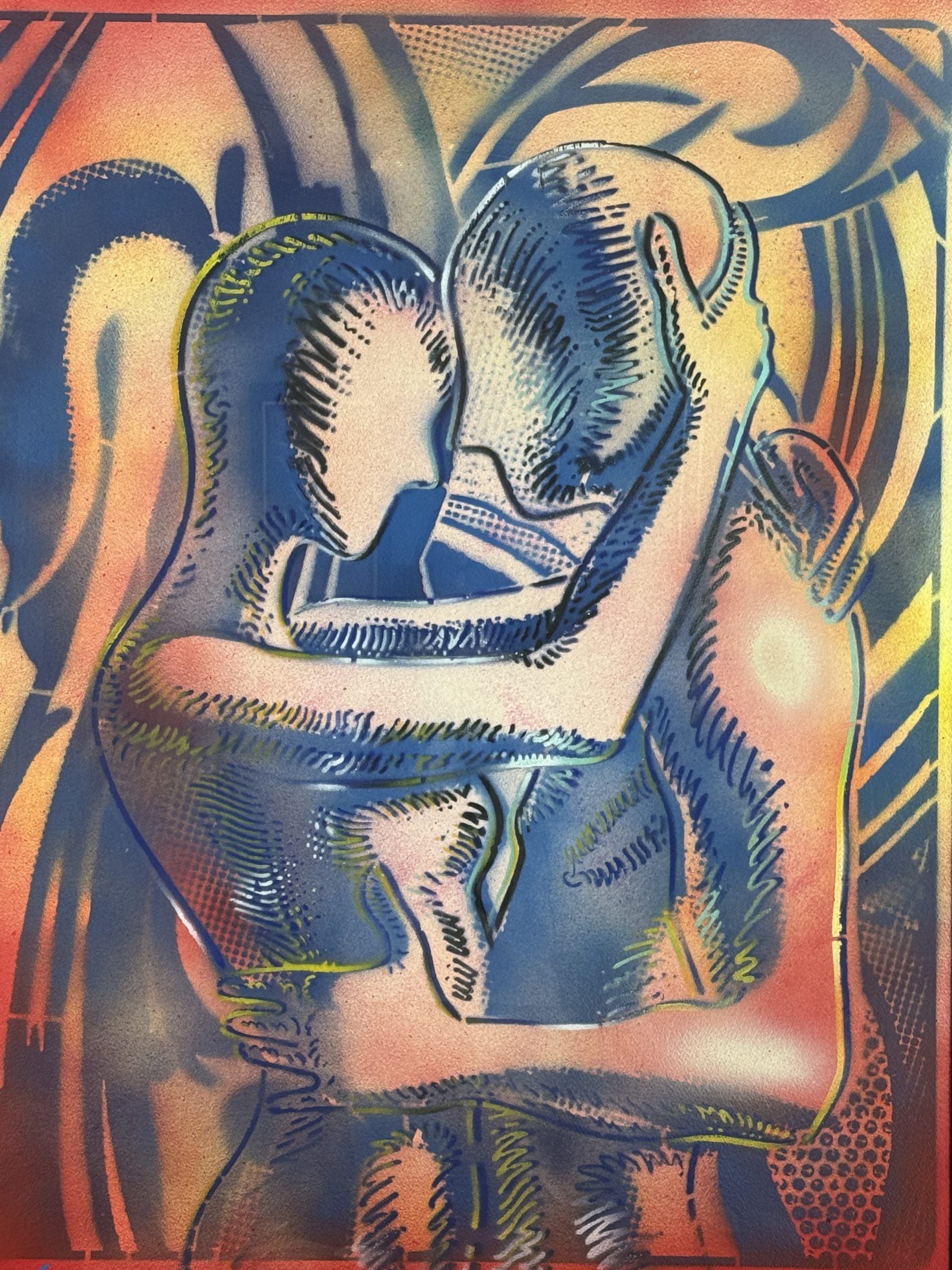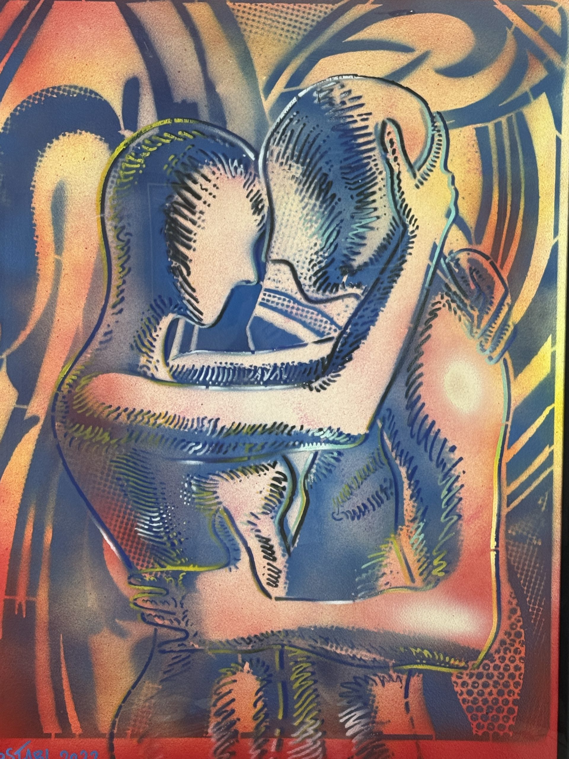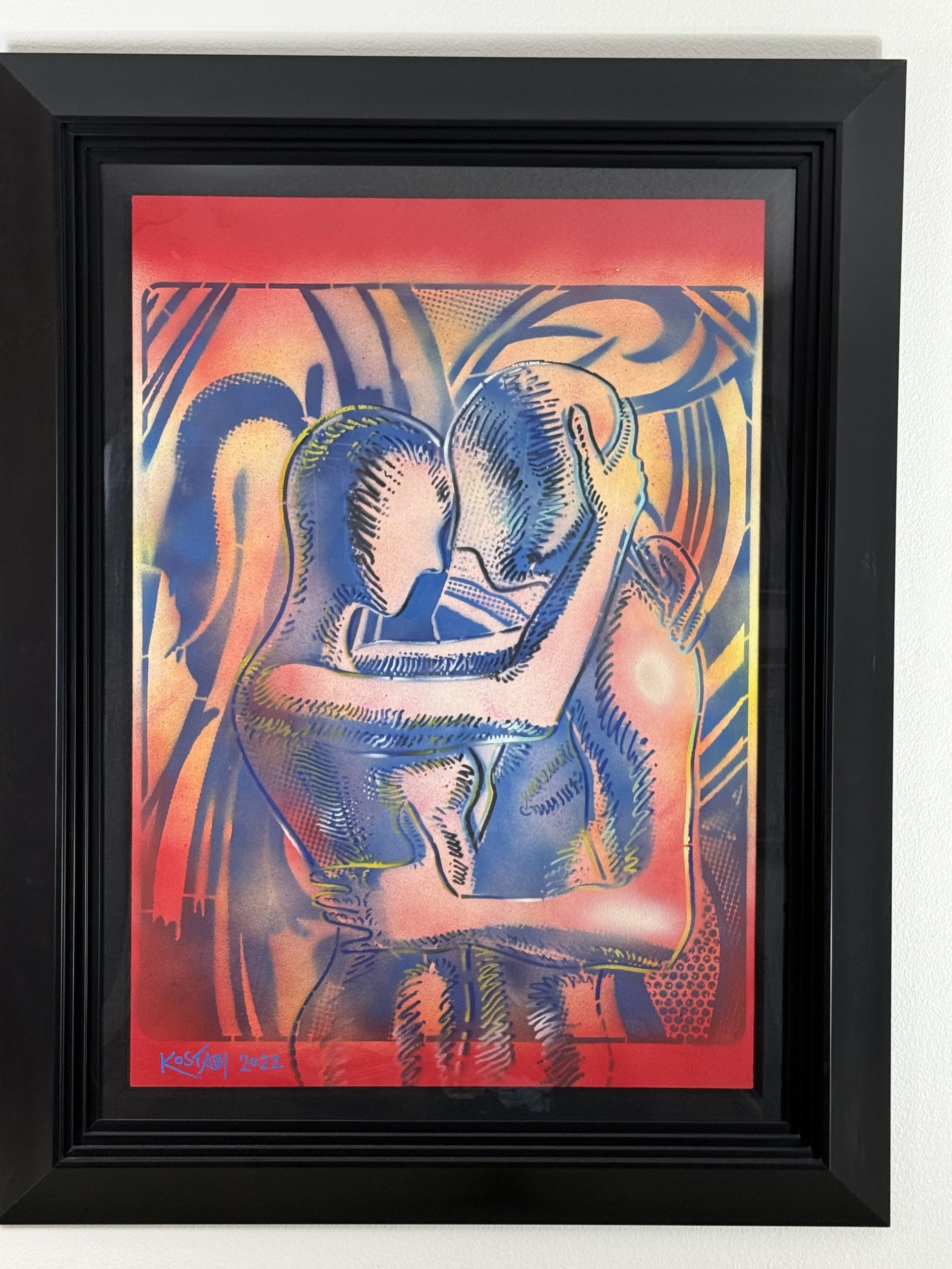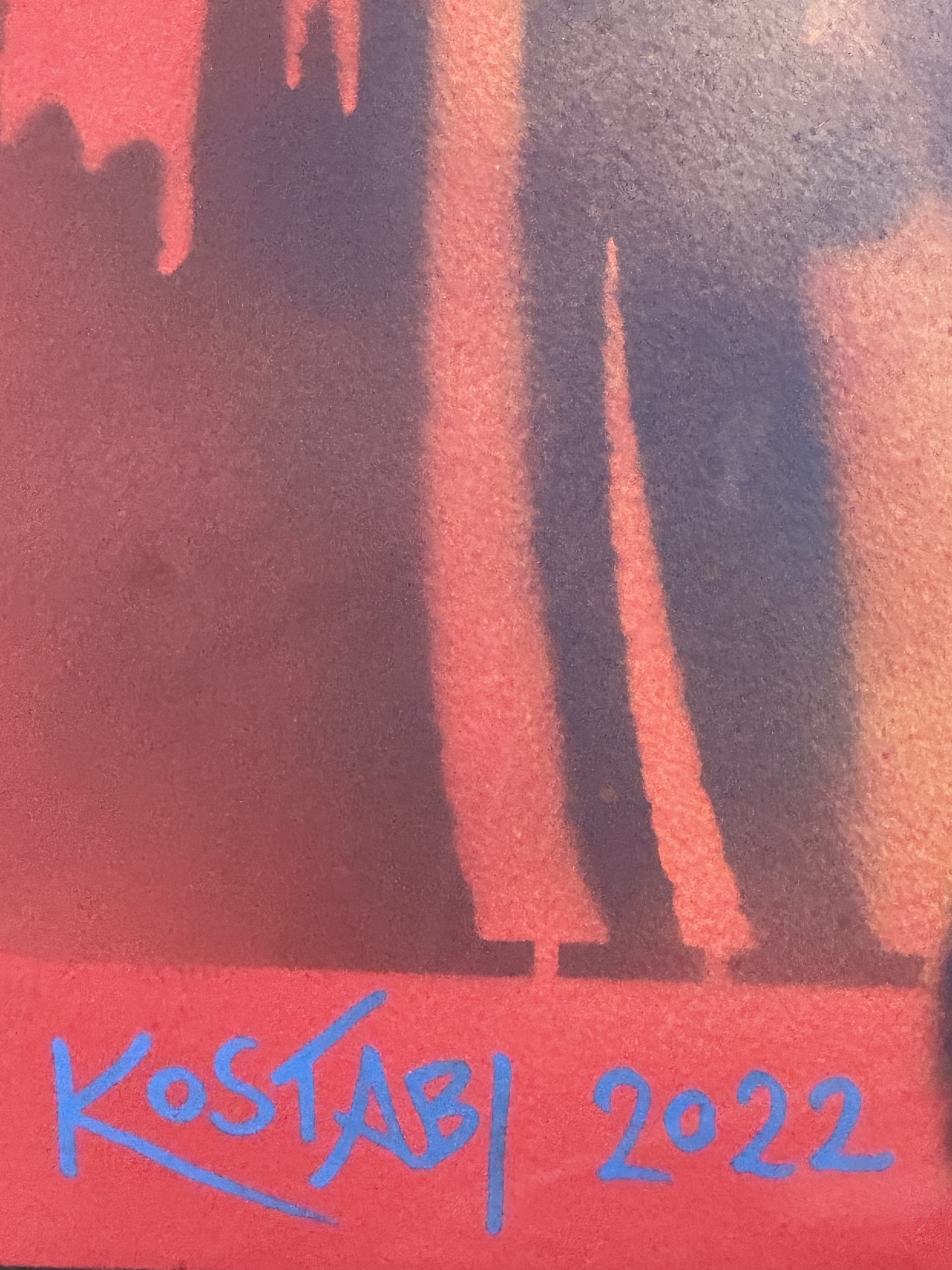 DCollect this amazing piece by the legendary Mark Kostabi. This awesome painting has massive presence with it’s custom frame.