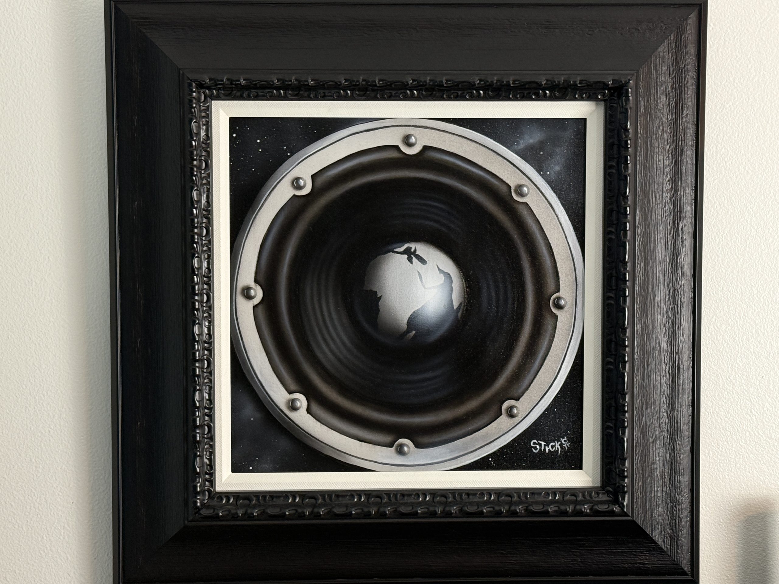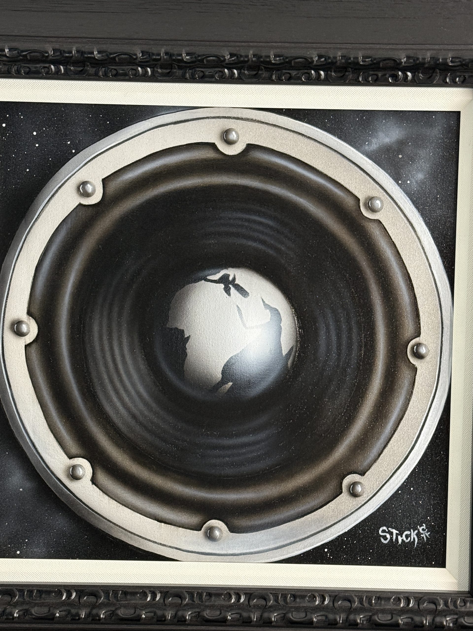 Graduating from a Jekyll and Hyde influence early in his career, in which he divided his time between family portraits and airbrush design work on helmets and Harleys, Stickman had the epiphany to combine both styles while reading “According to the Rolling Stones”. Two weeks later he finished his first canvas portrait of Mick Jagger, aptly titled “Please allow me to introduce myself”, which forever changed the direction of his career in the art world.