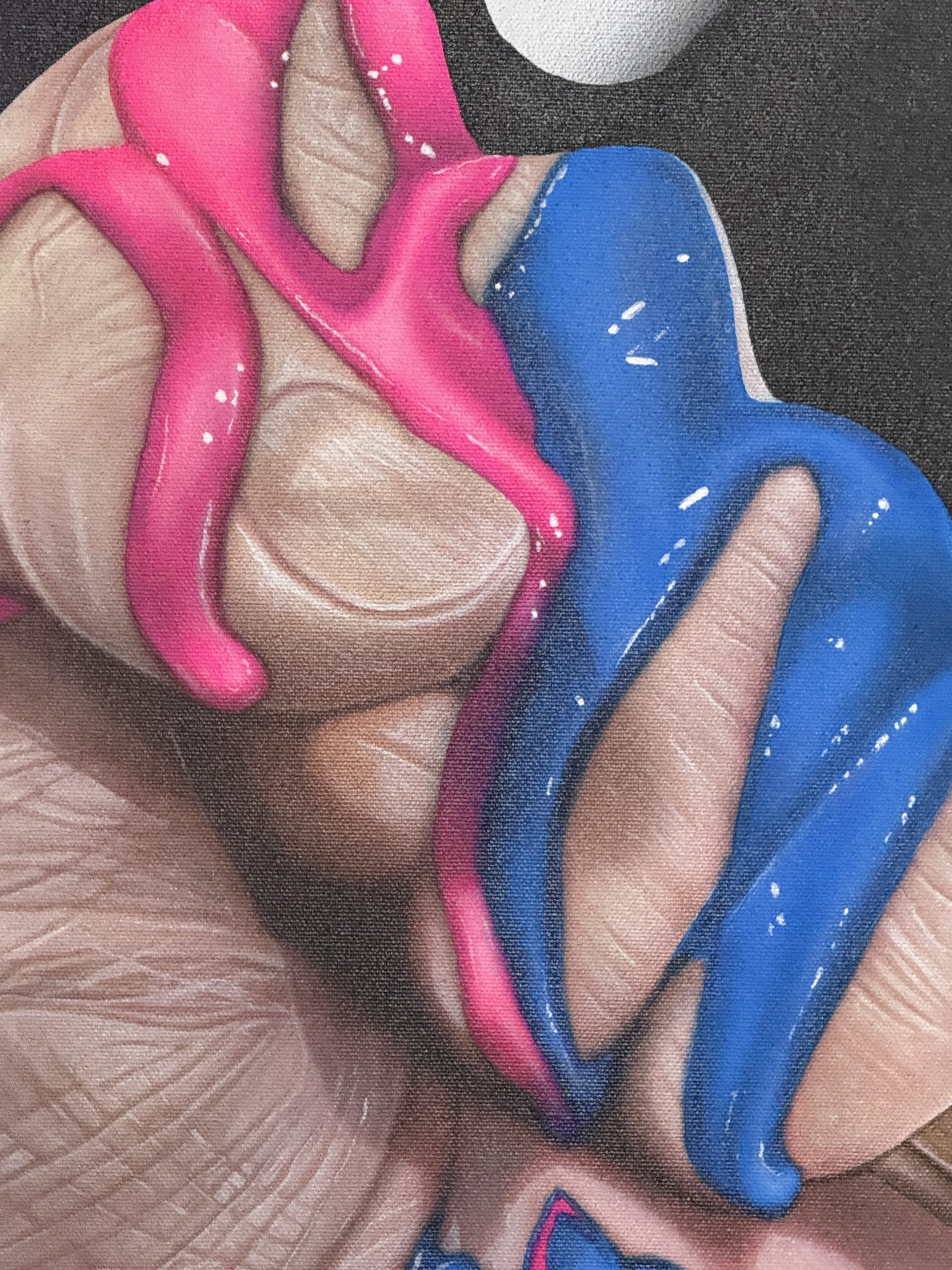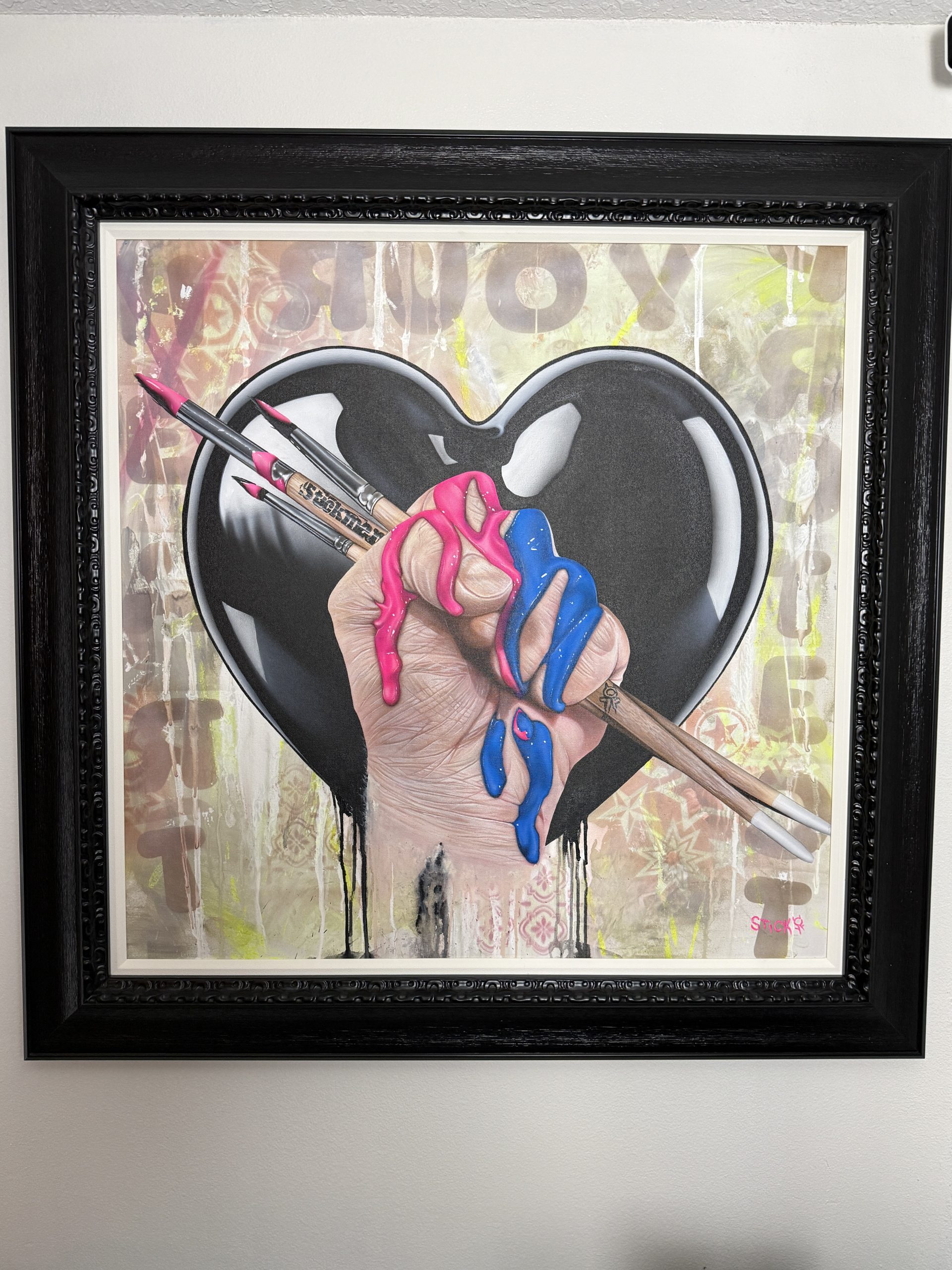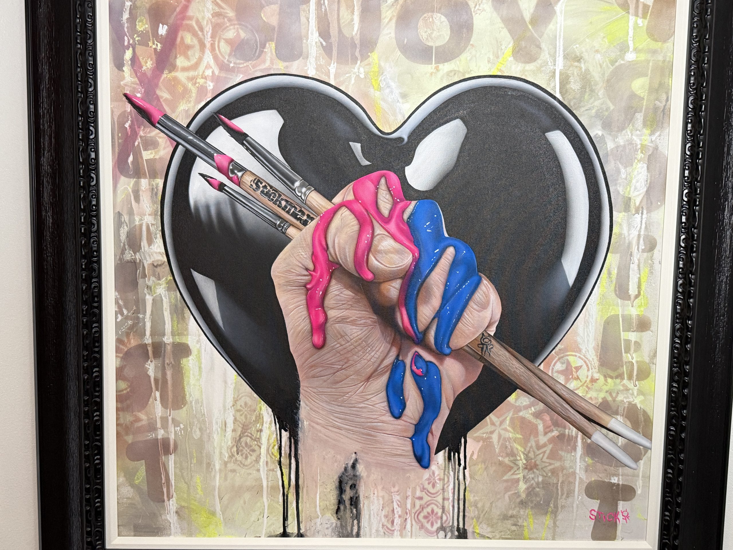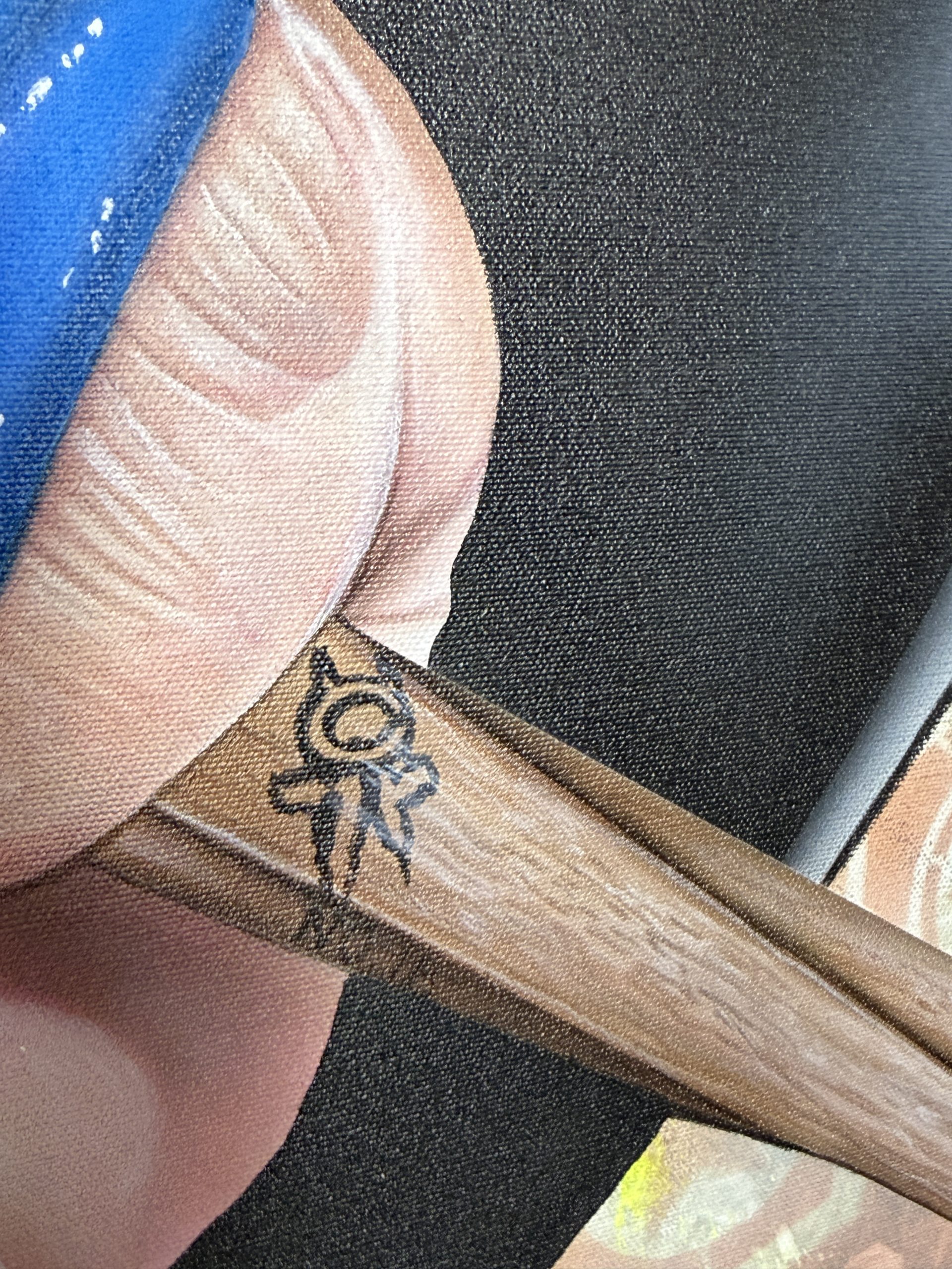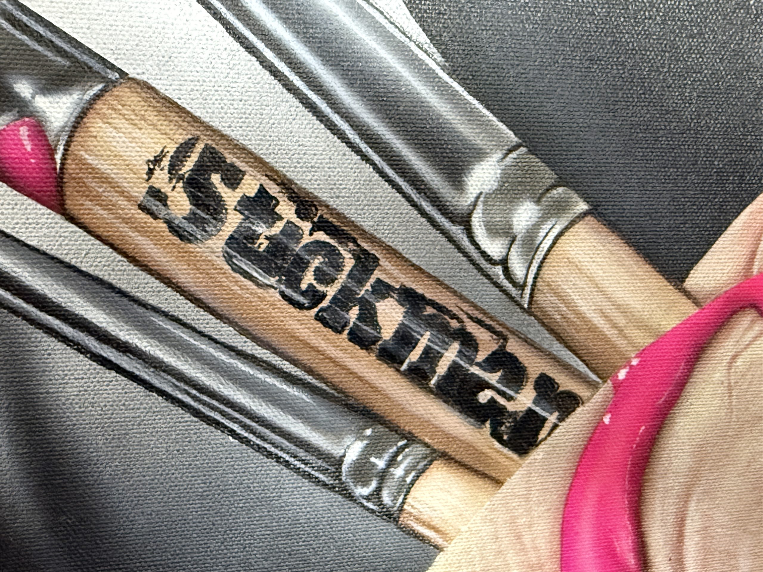 Graduating from a Jekyll and Hyde influence early in his career, in which he divided his time between family portraits and airbrush design work on helmets and Harleys, Stickman had the epiphany to combine both styles while reading “According to the Rolling Stones”. Two weeks later he finished his first canvas portrait of Mick Jagger, aptly titled “Please allow me to introduce myself”, which forever changed the direction of his career in the art world.